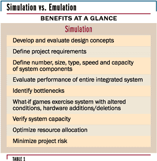Even today, many would-be end users of software modeling confuse simulation and emulation. However, the difference between the two is distinct and important . Simulation is generally applied in the early stages of a project and uses simplifying assumptions to predict overall system performance (See Table 1).