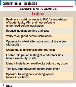 For example, Retrotech Inc. (Fishers, N.Y.), a system integration company specializing in updating automated warehouses, was hired to replace a complex AS/RS conveyor system at the Prairie du Chien-Wisconsin facility of 3M. The company developed the entire system in its office on a PC using real-time simulation and emulation. Retrotech was able to run the system as though the conveyors and cranes existed. In this way, they were able to test the control code and run a real-time demo for the customer before the system was shipped.