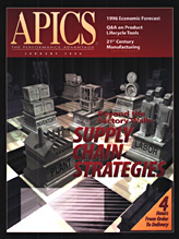 The following table of contents lists articles in the January 1996 print edition of APICS - The Performance Advantage. You may follow any of the linked titles to read those items in their entirety. For quick navigation you may jump directly to any of the following sections: Departments, Features, Resources or other APICS - The Performance Advantage web pages.